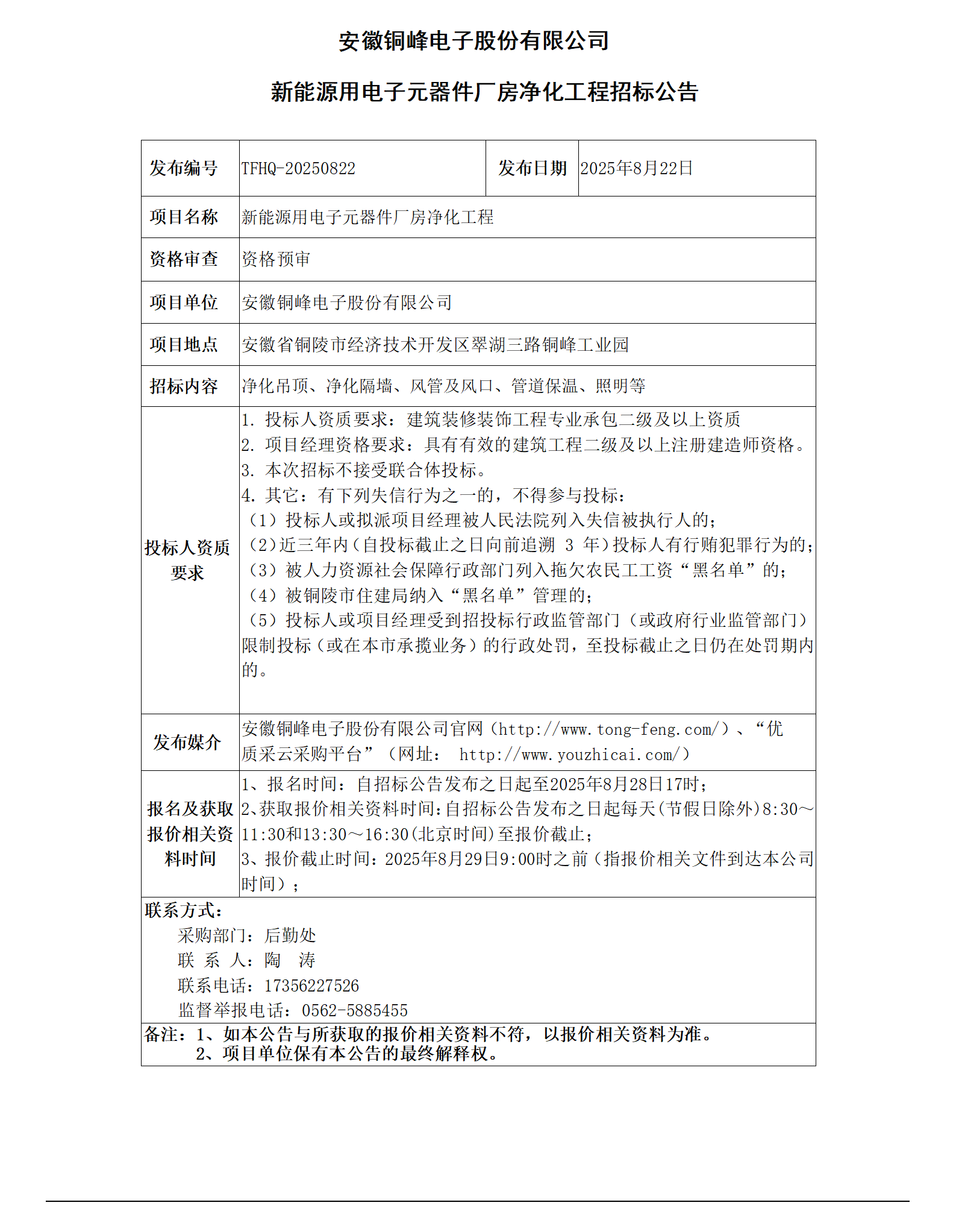 安徽銅峰電子股份有限公司 (新能源用電子元器件廠房?jī)艋こ?招標(biāo)公告)_01