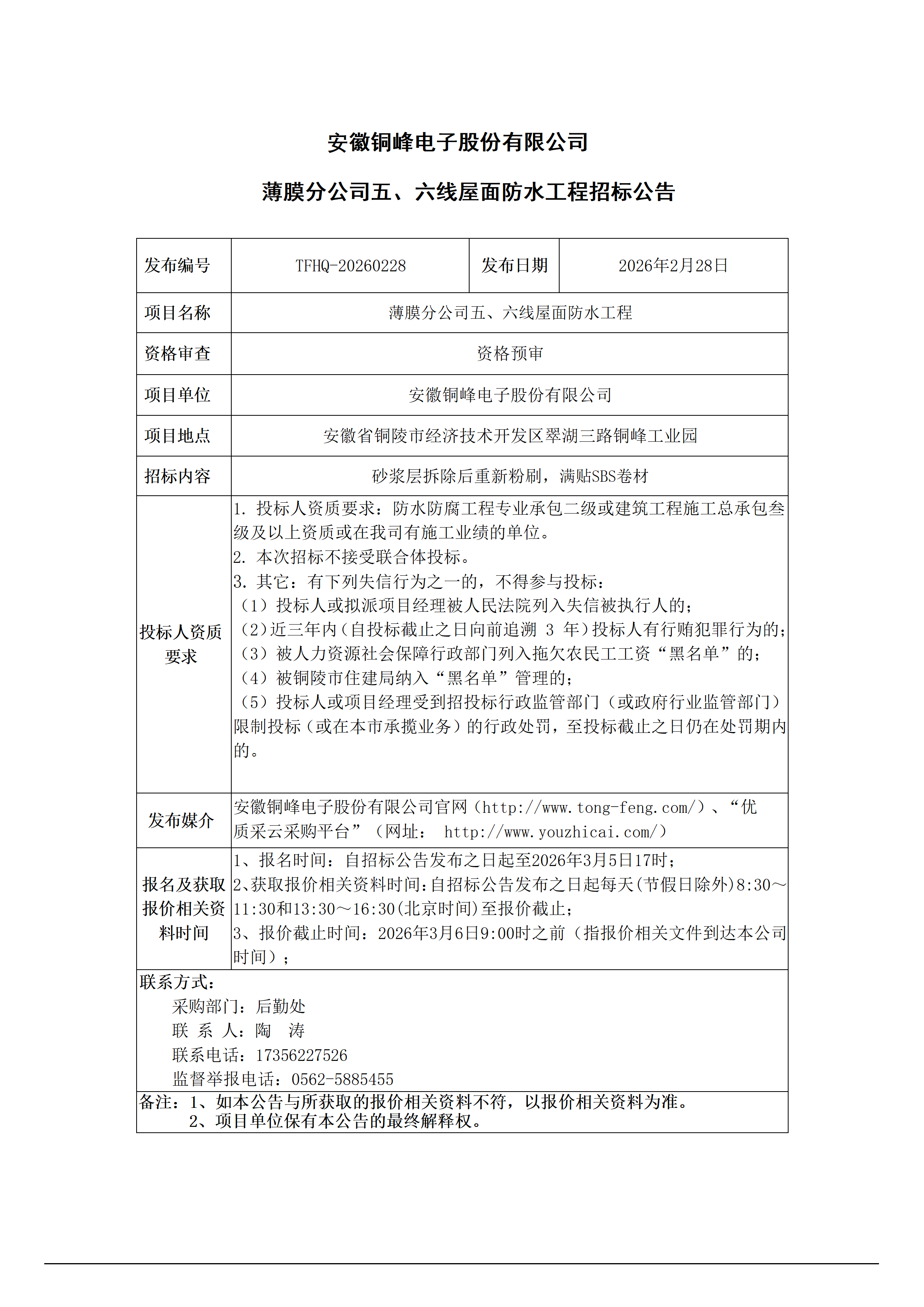 01安徽銅峰電子股份有限公司 (薄膜分公司五、六線屋面防水工程 招標公告)_01